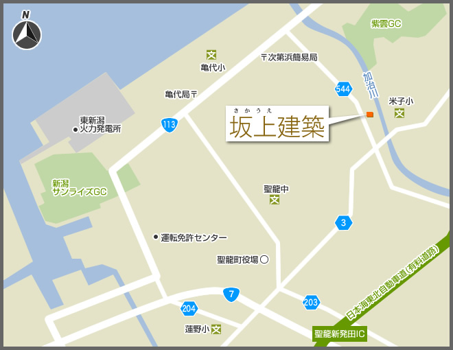 アクセス | 最寄駅:JR白新線・佐々木駅から車で10分 バス:紫雲寺橋停留所・徒歩2分 車:日本海東北道 聖篭新発田I.Cから車で5分 |
